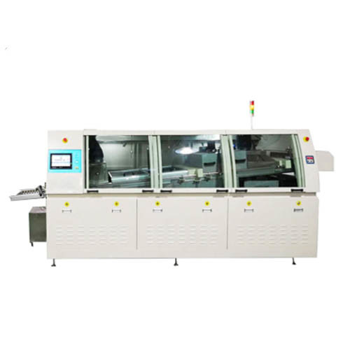 Les PCB avec des composants montés sont automatiquement introduits dans le système de convoyeur en chaîne, et passent par des processus de pulvérisation, de préchauffage, de soudure par ondes et de refroidissement avant de sortir du système.